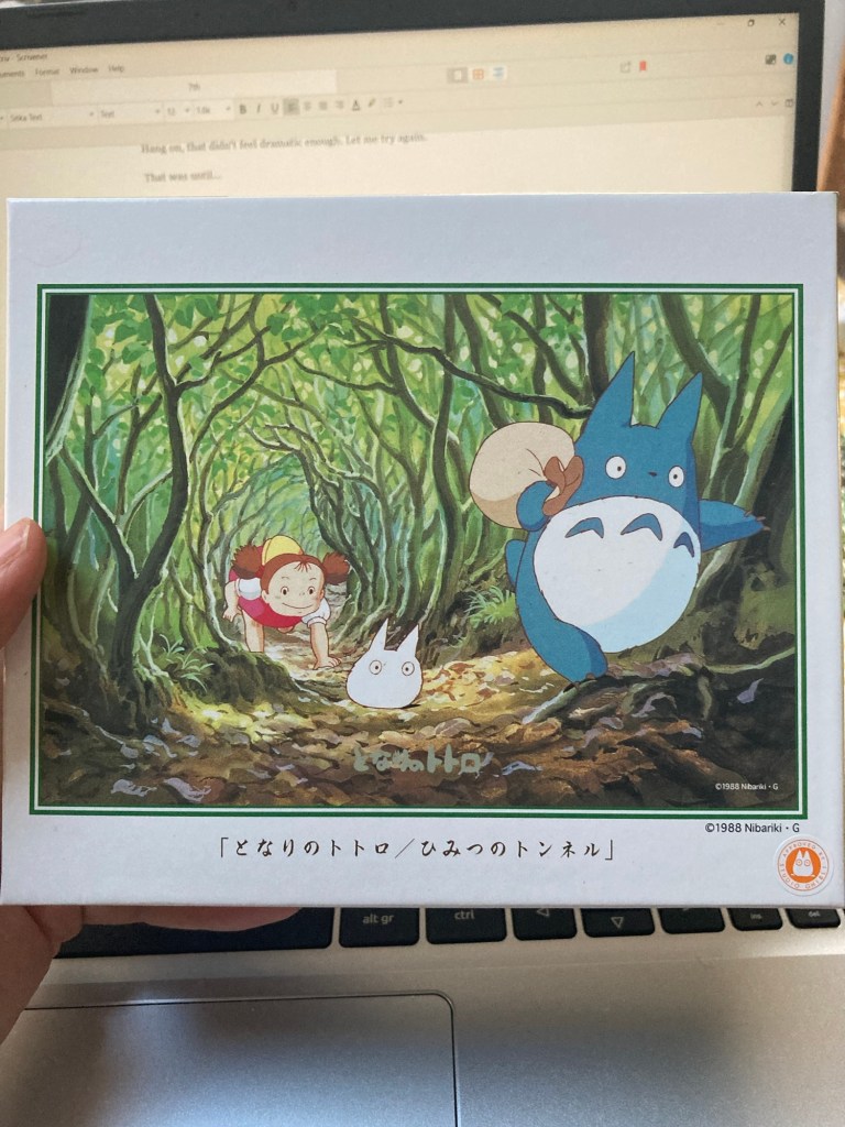 This puzzle is a shot from Studio Ghibli’s animated classic My Neighbour Totoro – a film I love (and with a fantastic stage adaptation too – go see it if you get a chance. Absolutely mind blowingly beautiful). I’m loving watching the playful characters and the forest background slowly come together. We usually listen to the mellow, jazzy vibes of Norah Jones as we puzzle too – just an all round massage for the brain cells.