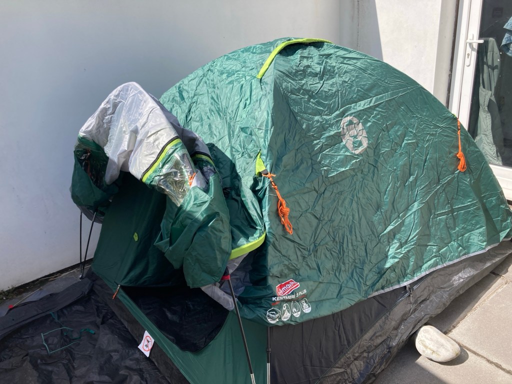 I have a tent which seems to be going a bit mouldy. I have a sleeping bag from a stranger (now freshly washed). I have two cans of gas and a stove attachement. I have a backpack which seems far too large. I have a ‘self inflating’ bed which does not self inflate*.