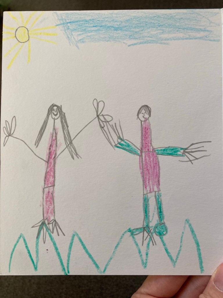 But, to balance that out with an up, I did receive a card from my niece where she wrote that she loved me and drew my new favourite piece of art of the two of us: