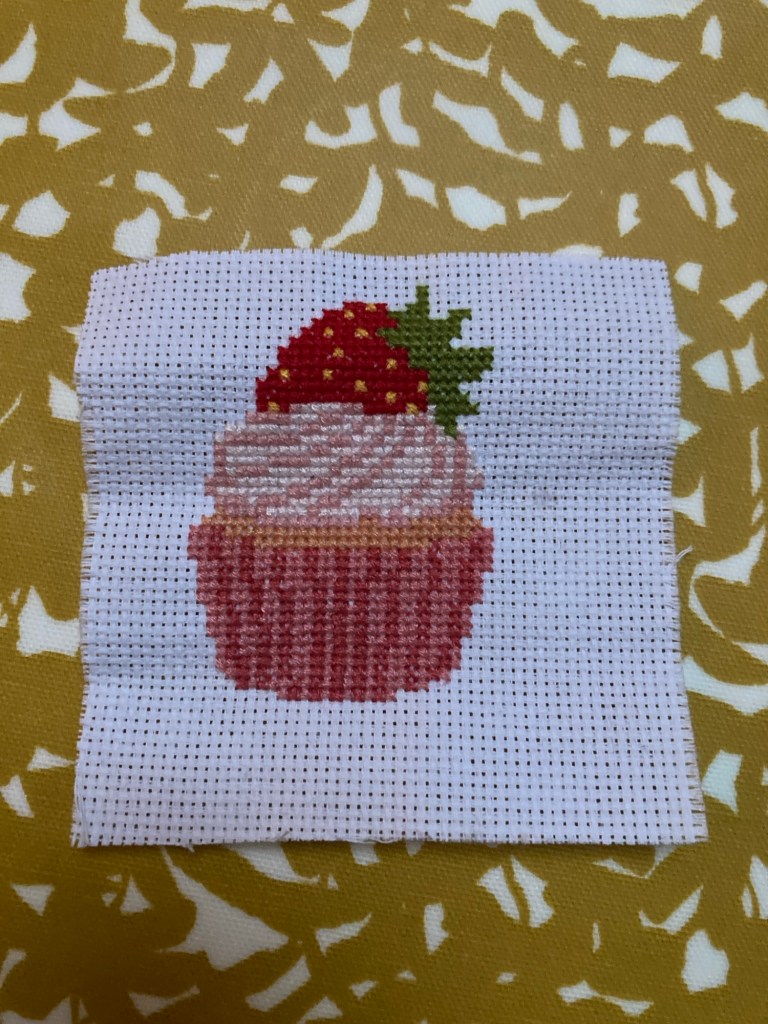 I have just finished another cross-stitch as well – a strawberry cup-cake thing which took me a lot longer than I thought it would. I think the red thread of the strawberry has been my favourite colour to work with so far on my cross-stitch adventures.